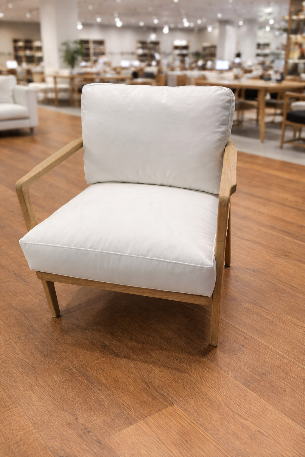 Beautiful brand-new accent chair sourced directly from a local interior designer’s showroom (never used in a home). Originally $1400. Light oak frame, plush neutral cushions, and stunning woven rope back detail — very Serena & Lily–inspired coastal luxury.